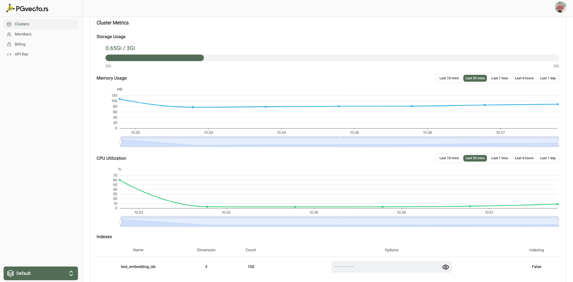 You can view the cpu and memory usage of your cluster in the cluster info page, and you can also view the index info for example the number of vectors in the index, the dimension of the vectors etc. For detailed information about monitoring, see Monitoring.